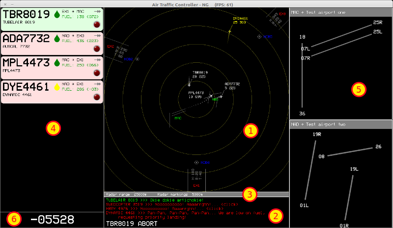 - Radar targets (aeroplanes), with their flight number, altitude and speed indicated in the label next to them.